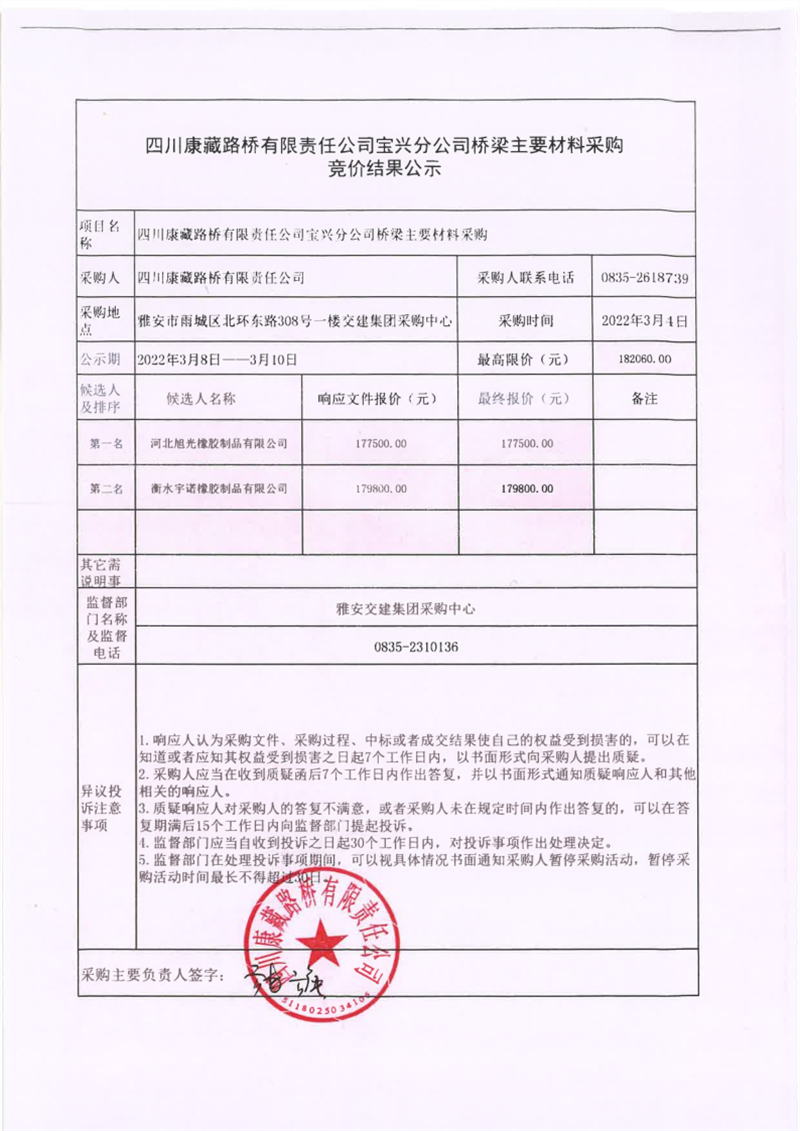 四川康藏路橋有限責(zé)任公司寶興分公司橋梁主要材料采購競價結(jié)果公示