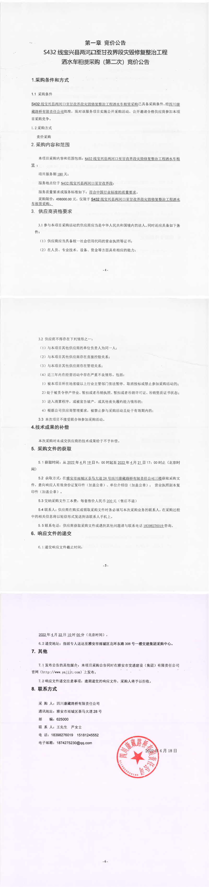 四川康藏路橋有限責(zé)任公司S432線寶興縣兩河口至甘孜界段災(zāi)毀修復(fù)整治工程灑水車(chē)租賃采購(gòu)(第二次)競(jìng)價(jià)公告