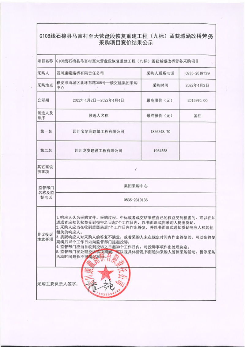 四川康藏路橋有限責(zé)任公司G108線石棉縣馬富村至大營(yíng)盤段恢復(fù)重建工程(九標(biāo))孟獲城涵改橋勞務(wù)采購(gòu)項(xiàng)目競(jìng)價(jià)結(jié)果公示