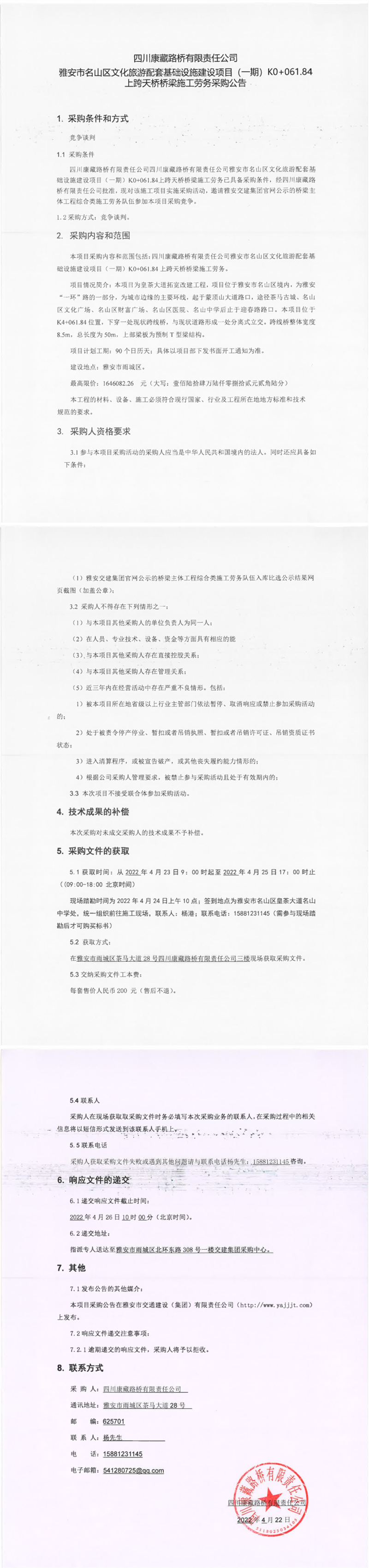 四川康藏路橋有限責(zé)任公司雅安市名山區(qū)文化旅游配套基礎(chǔ)設(shè)施建設(shè)項目(一期)K0+061.84上跨天橋橋梁施工勞務(wù)采購公告