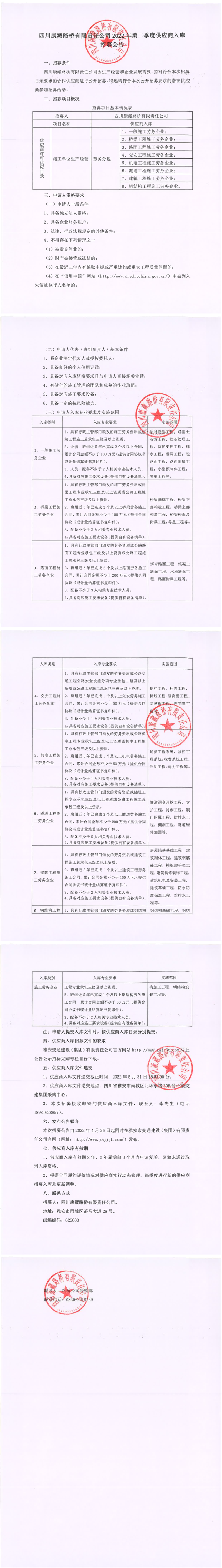 四川康藏路橋有限責任公司2022年第二季度供應(yīng)商入庫招募公告