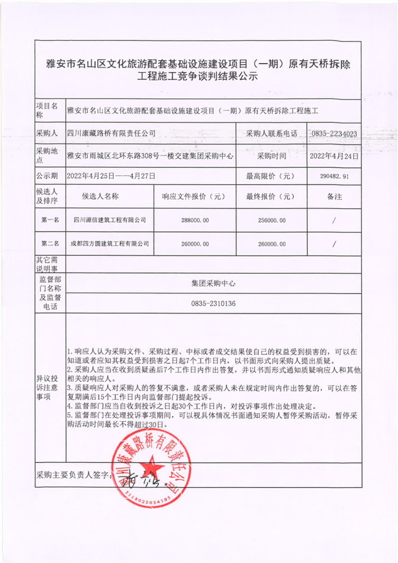 四川康藏路橋有限責(zé)任公司雅安市名山區(qū)文化旅游配套基礎(chǔ)設(shè)施建設(shè)項(xiàng)目(一期)原有天橋拆除工程施工競(jìng)爭(zhēng)談判結(jié)果公示