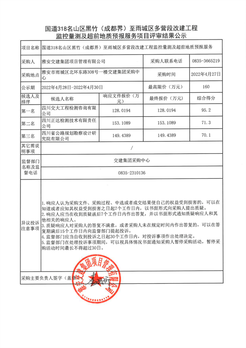 雅安交建集團項目管理有限公司國道318名山區(qū)黑竹(成都界)至雨城區(qū)多營段改建工程監(jiān)控量測及超前地質預報服務項目評審結果公示