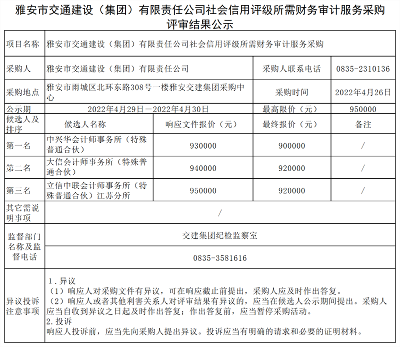 雅安市交通建設(shè)(集團(tuán))有限責(zé)任公司社會(huì)信用評(píng)級(jí)所需財(cái)務(wù)審計(jì)服務(wù)采購評(píng)審結(jié)果公示