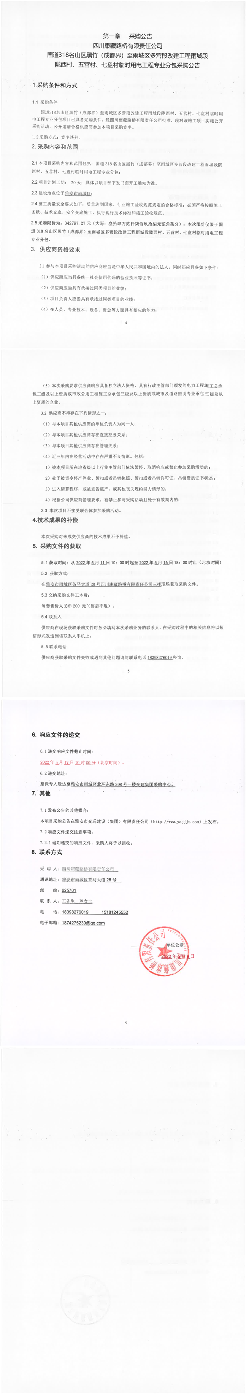 四川康藏路橋有限責(zé)任公司國道318名山區(qū)黑竹(成都界)至雨城區(qū)多營段改建工程雨城段隴西材、五營村、七盤村臨時用電工程專業(yè)分包采購公告