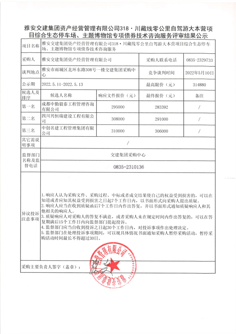 雅安交建集團(tuán)資產(chǎn)經(jīng)營(yíng)管理有限公司318·川藏線零公里自駕游大本營(yíng)項(xiàng)目投資價(jià)值分析及未來(lái)收益論證服務(wù)評(píng)審結(jié)果公示