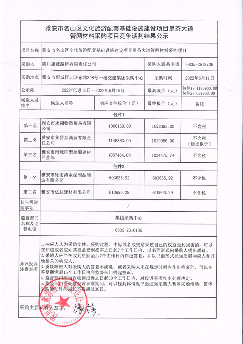 四川康藏路橋有限責任公司雅安市名山區(qū)文化旅游配套基礎設施建設項目皇茶大道管網(wǎng)材料采購項目競爭談判結果公示