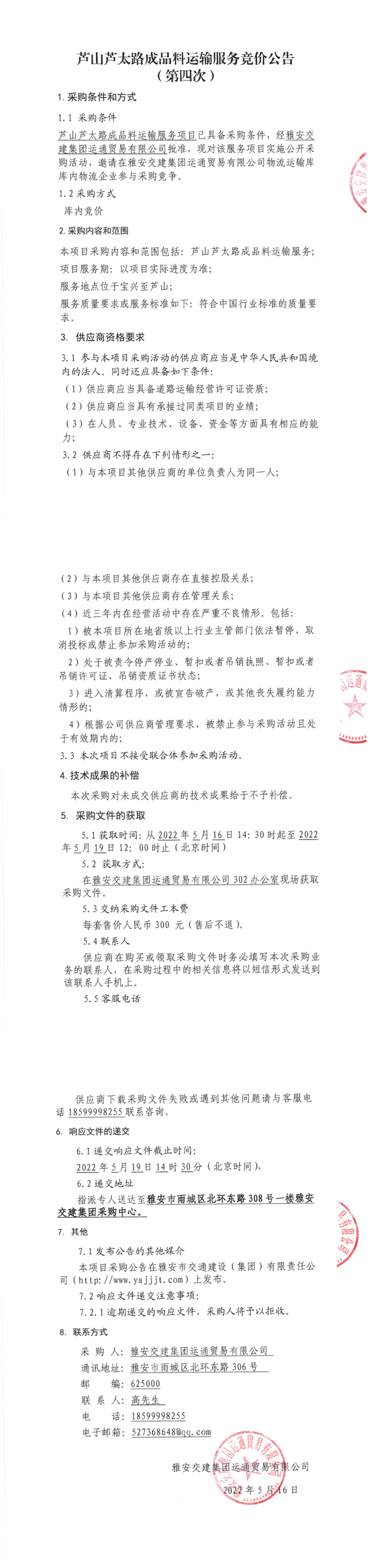 雅安交建集團(tuán)運(yùn)通貿(mào)易有限公司蘆山蘆太路成品料運(yùn)輸服務(wù)競(jìng)價(jià)公告(第四次)