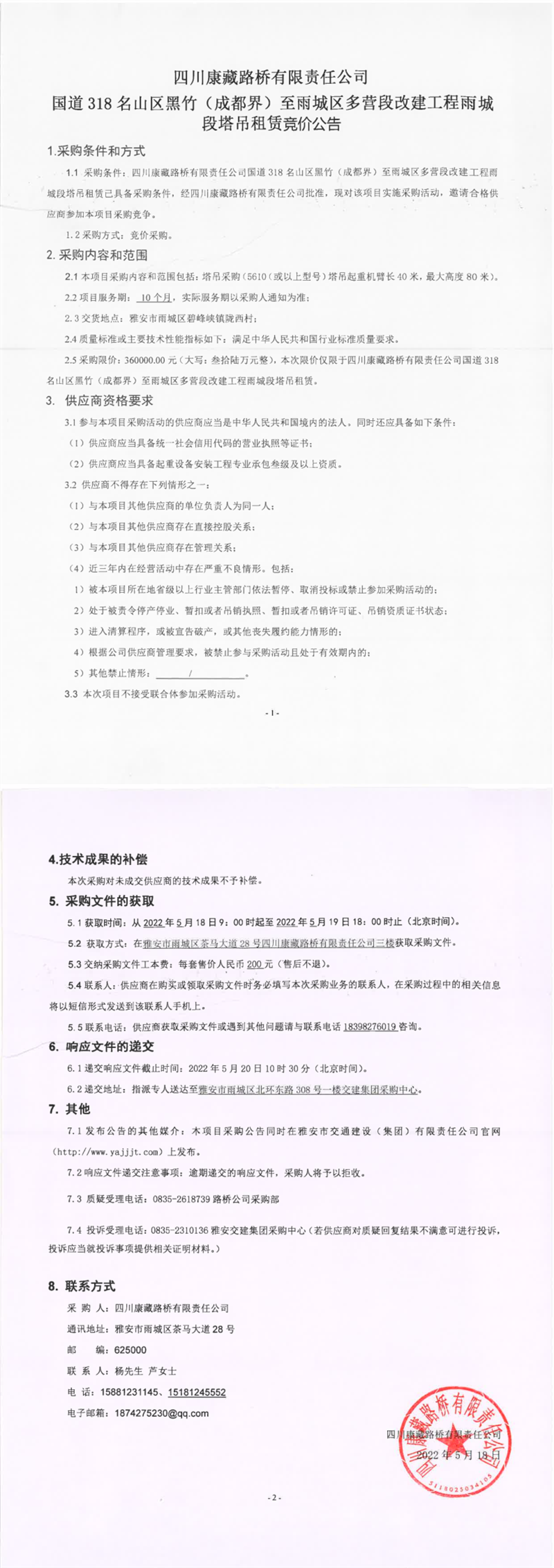四川康藏路橋有限責(zé)任公司國(guó)道318名山區(qū)黑竹(成都界)至雨城區(qū)多營(yíng)段改建工程雨城段塔吊租賃競(jìng)價(jià)公告