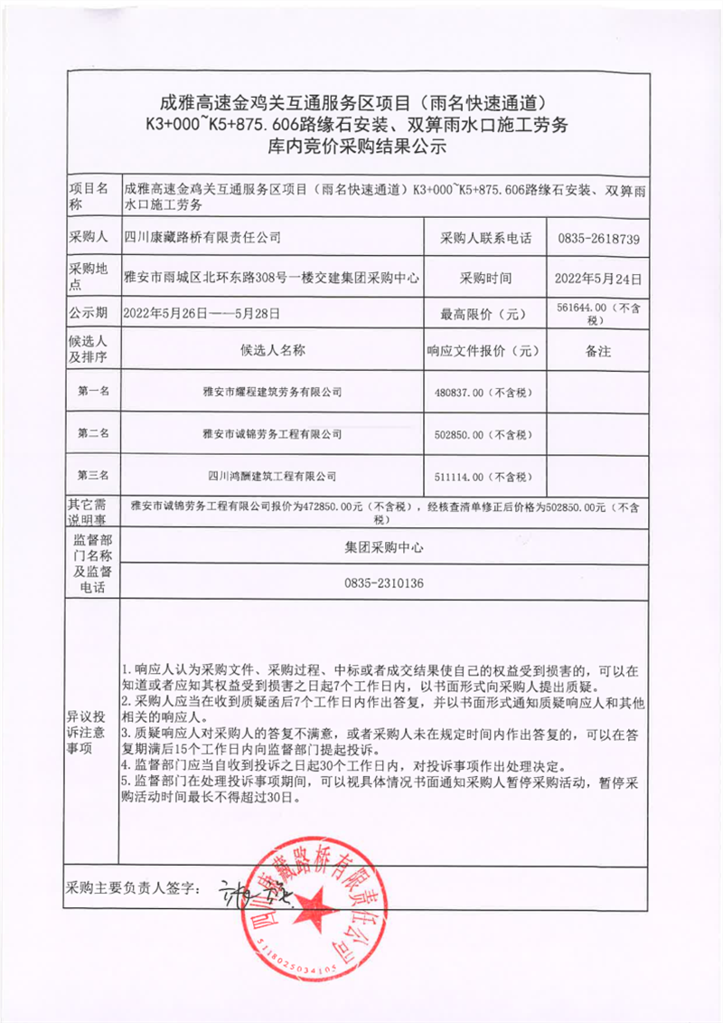 四川康藏路橋有限責任公司成雅高速金雞關(guān)互通服務(wù)區(qū)項目(雨名快速通道)K3+000~K5+875.606路緣石安裝、雙箅雨水口施工勞務(wù)庫內(nèi)競價采購結(jié)果公示