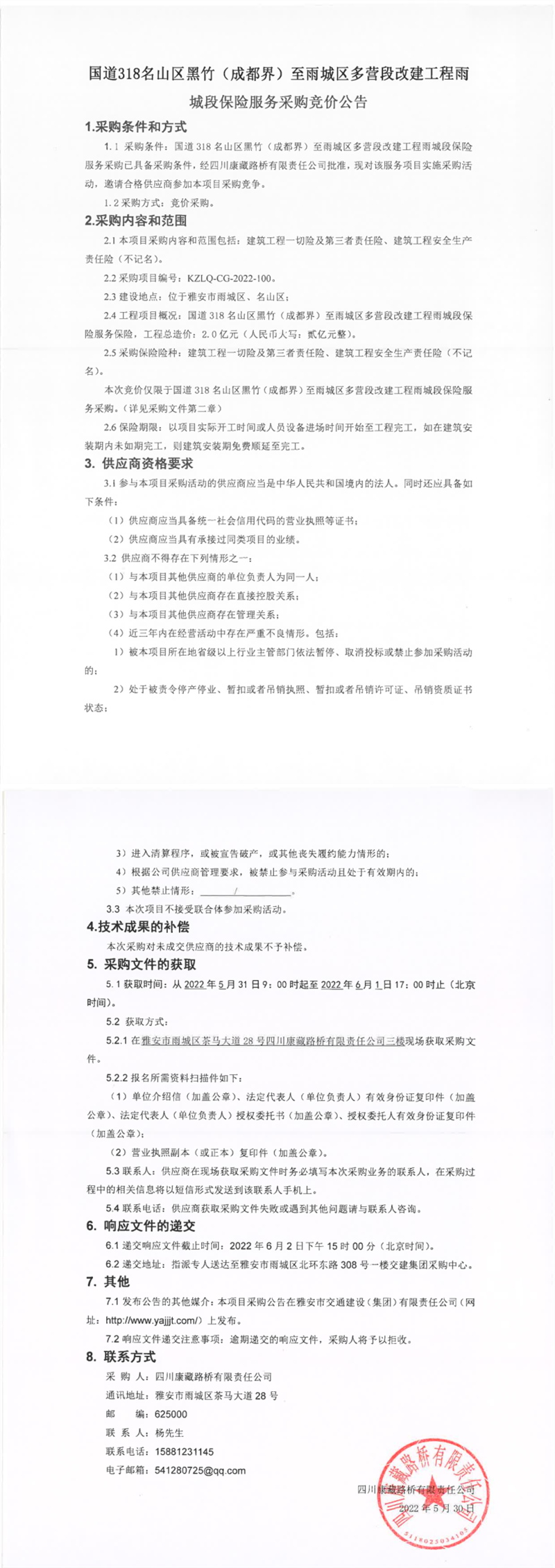 四川康藏路橋有限責(zé)任公司國道318名山區(qū)黑竹(成都界)至雨城區(qū)多營段改建工程雨城段保險(xiǎn)服務(wù)采購競價公告