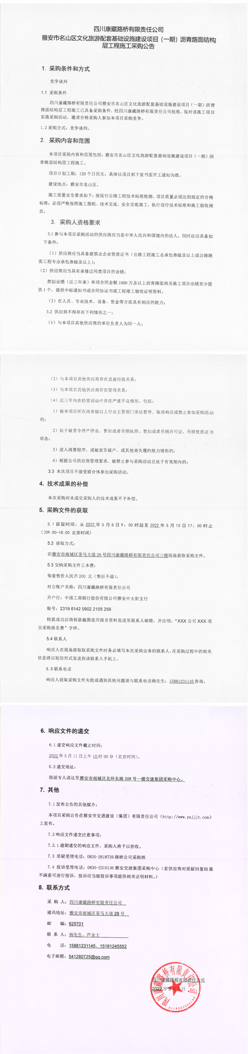 四川康藏路橋有限責任公司雅安市名山區(qū)文化旅游配套基礎(chǔ)設(shè)施建設(shè)項目(一期)瀝青路面結(jié)構(gòu)層工程施工采購公告