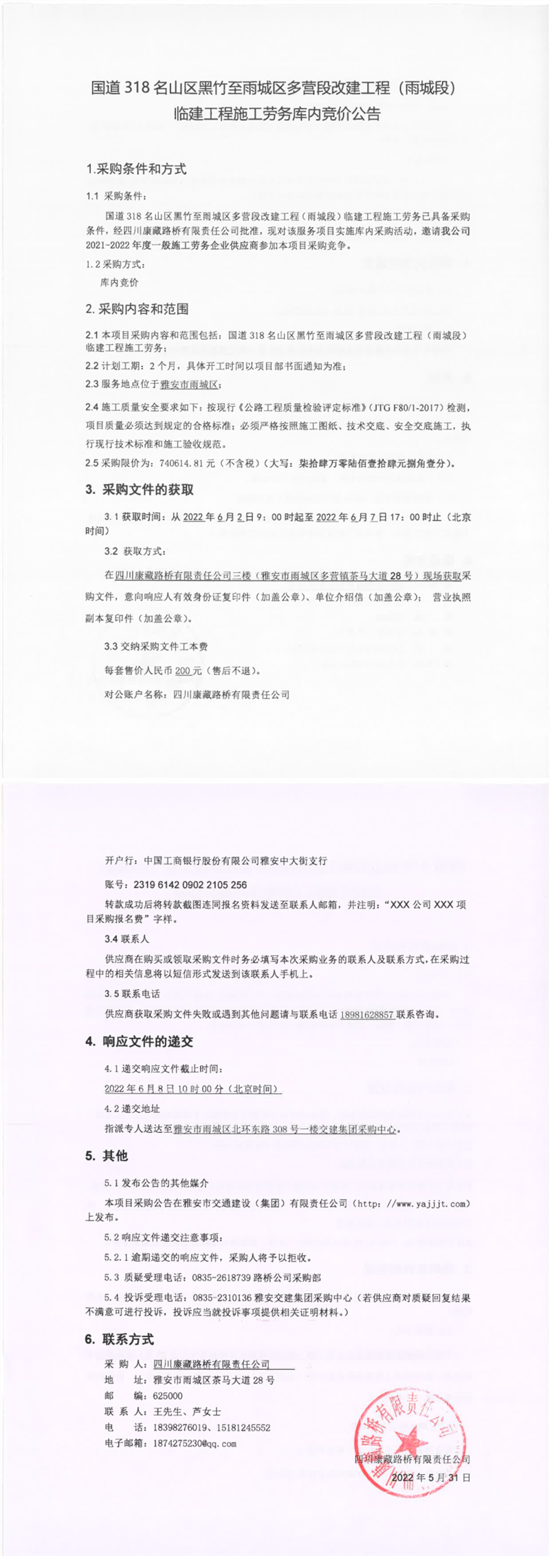 四川康藏路橋有限責任公司國道318名山區(qū)黑竹至雨城區(qū)多營段改建工程(雨城段)臨建工程施工勞務庫內(nèi)競價公告
