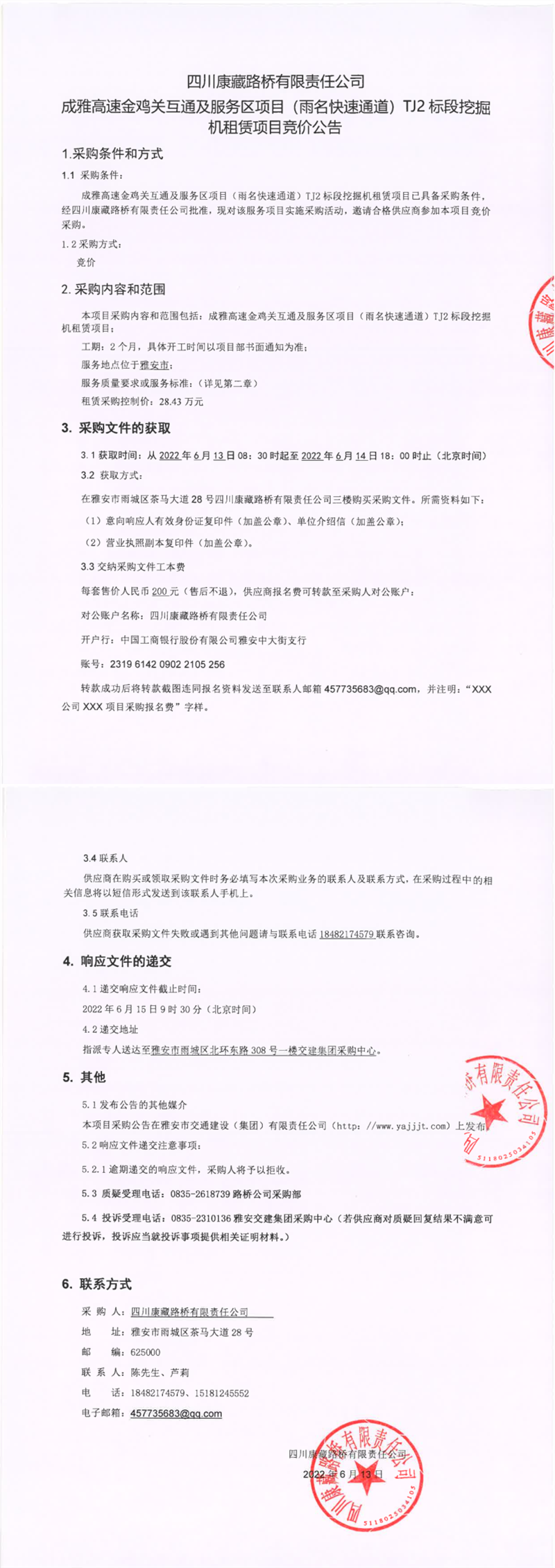 四川康藏路橋有限責任公司成雅高速金雞關互通及服務區(qū)項目(雨名快速通道)TJ2標段挖掘機租賃項目競價公告