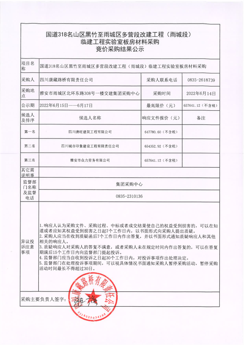 四川康藏路橋有限責(zé)任公司國道318名山區(qū)黑竹至雨城區(qū)多營段改建工程(雨城段)臨建工程實(shí)驗(yàn)室板房材料采購競價(jià)采購結(jié)果公示