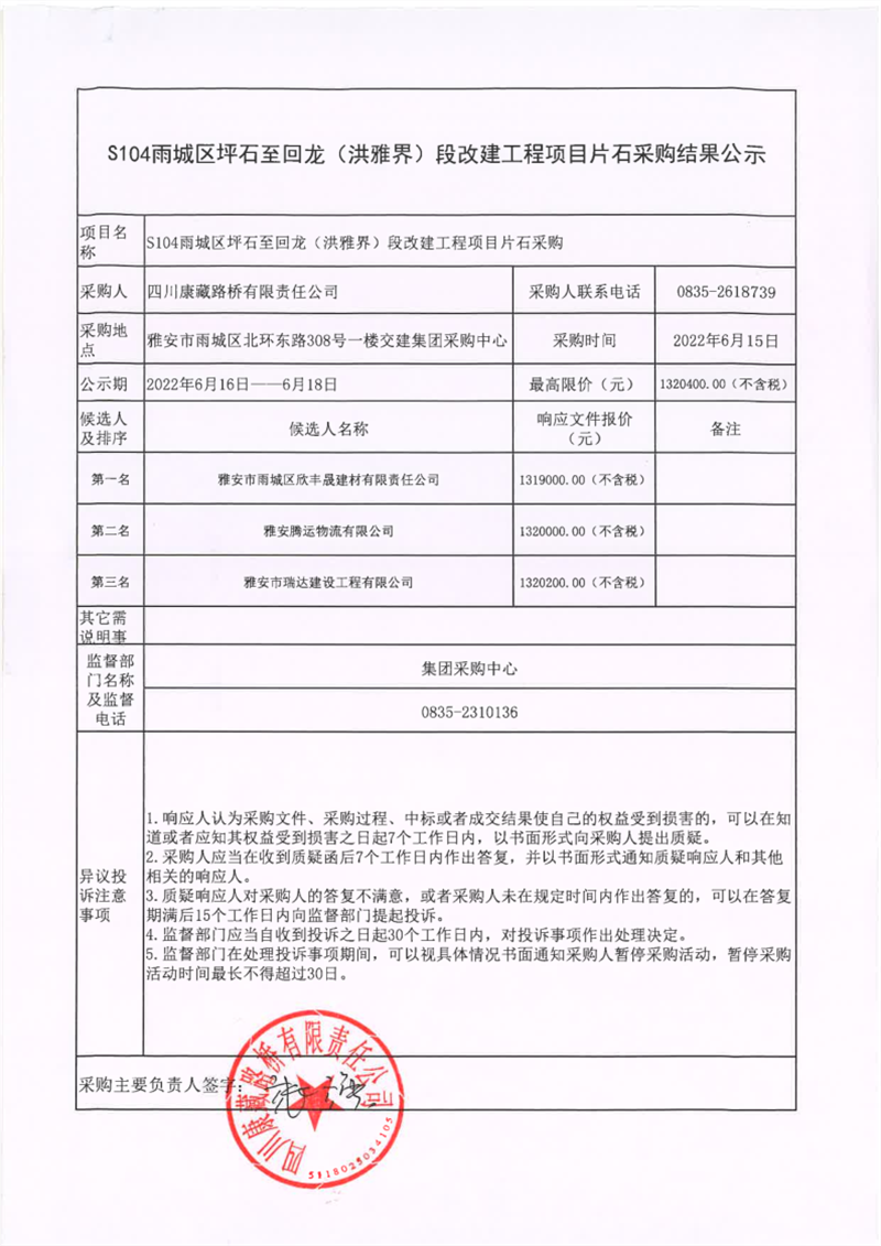 四川康藏路橋有限責任公司S104雨城區(qū)坪石至回龍(洪雅界)段改建工程項目片石采購結(jié)果公示