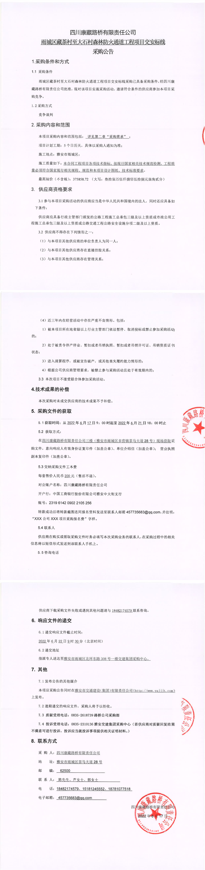 四川康藏路橋有限責(zé)任公司雨城區(qū)藏茶村至大石村森林防火通道工程項(xiàng)目交安標(biāo)線采購公告
