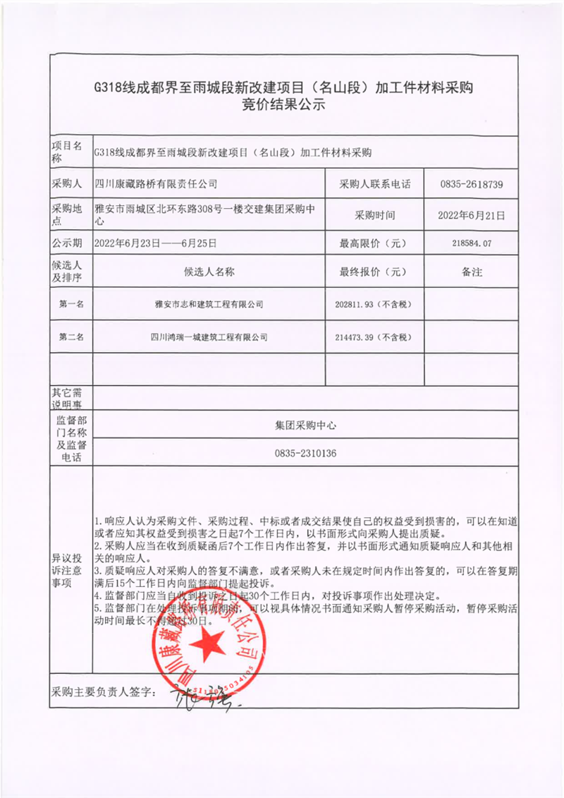 四川康藏路橋有限責任公司G318線成都界至雨城段新改建項目(名山段)加工件材料采購競價結(jié)果公示