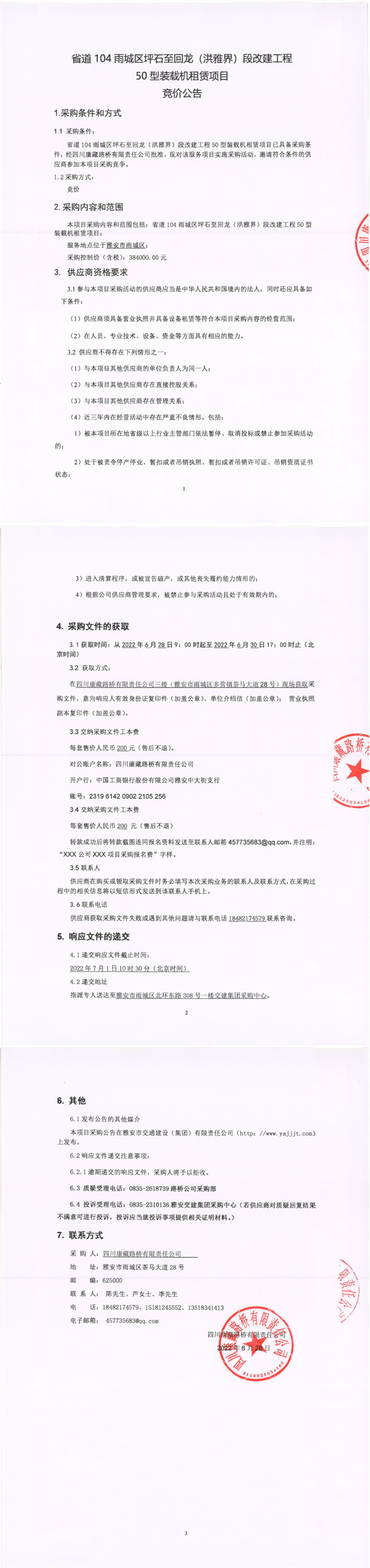 四川康藏路橋有限責(zé)任公司省道104雨城區(qū)坪石至回龍(洪雅界)段改建工程50型裝載機(jī)租賃項(xiàng)目競價公告