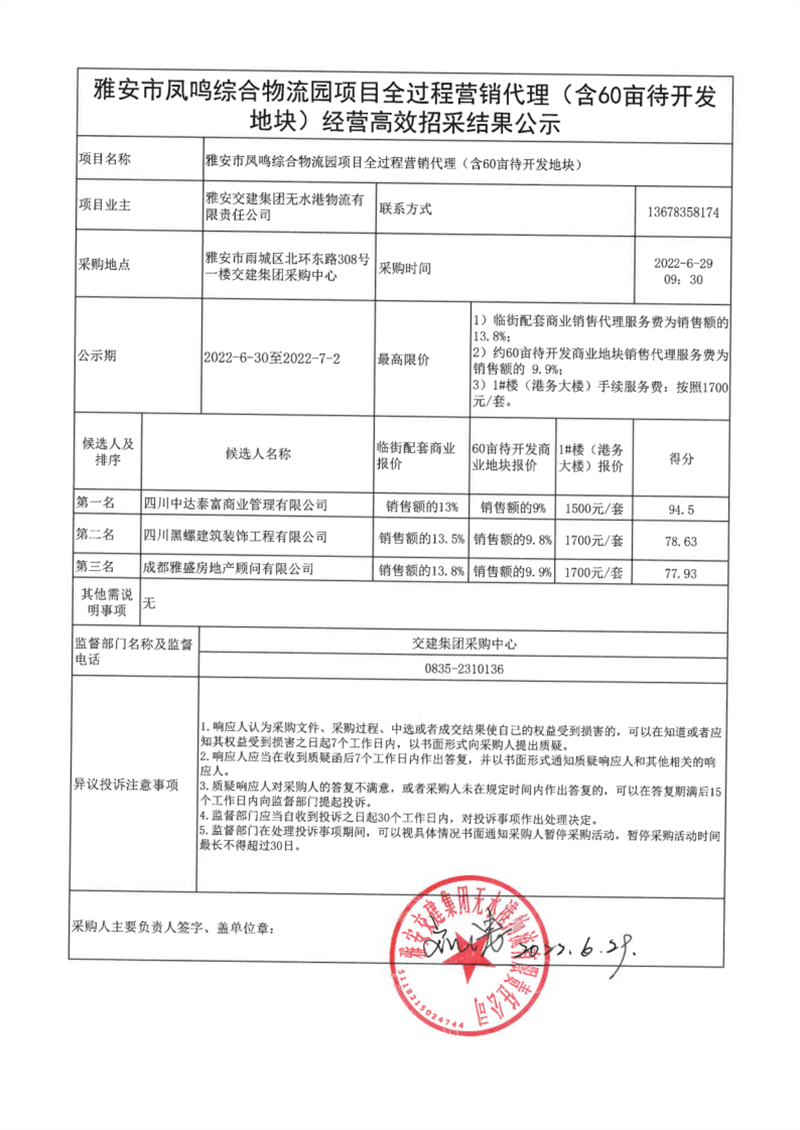 雅安交建集團(tuán)無水港物流有限責(zé)任公司雅安市鳳鳴綜合物流園項(xiàng)目全過程營銷代理(含60畝待開發(fā)地塊)經(jīng)營高效招采結(jié)果公示