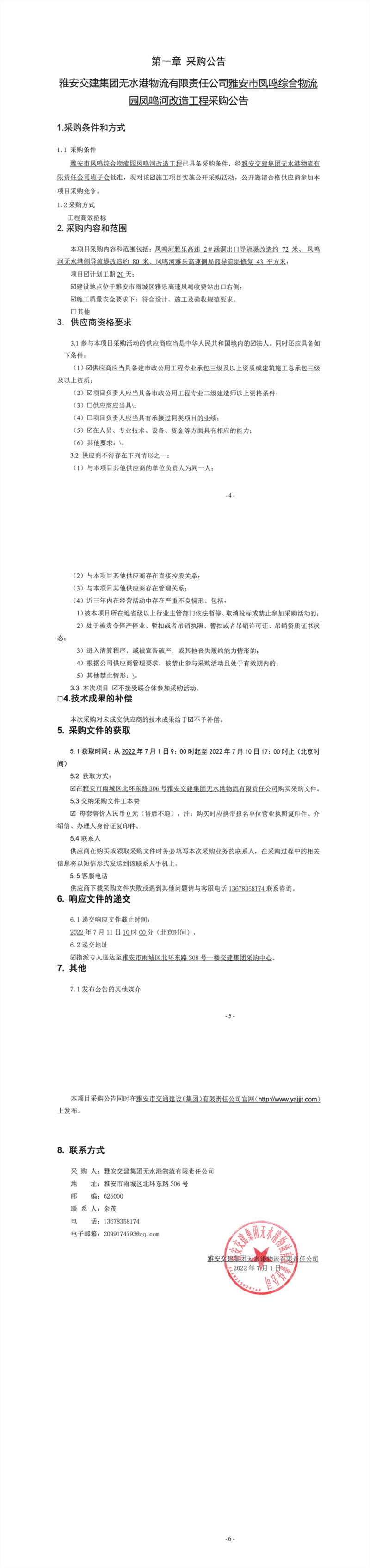 雅安交建集團無水港物流有限責任公司雅安市鳳鳴綜合物流園鳳鳴河改造工程采購公告