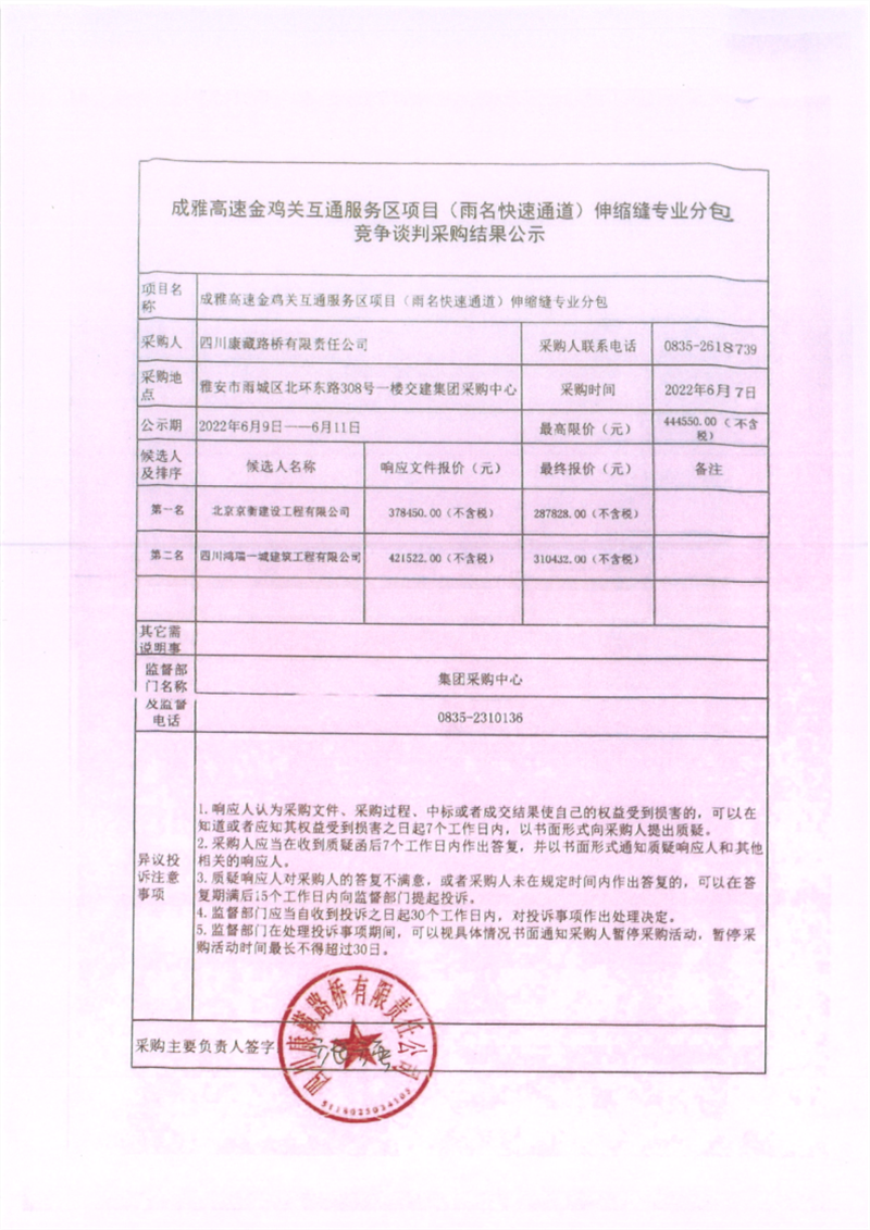 四川康藏路橋有限責(zé)任公司成雅高速金雞關(guān)互通服務(wù)區(qū)項(xiàng)目(雨名快速通道)伸縮縫工程專業(yè)分包競(jìng)爭(zhēng)談判采購結(jié)果公示