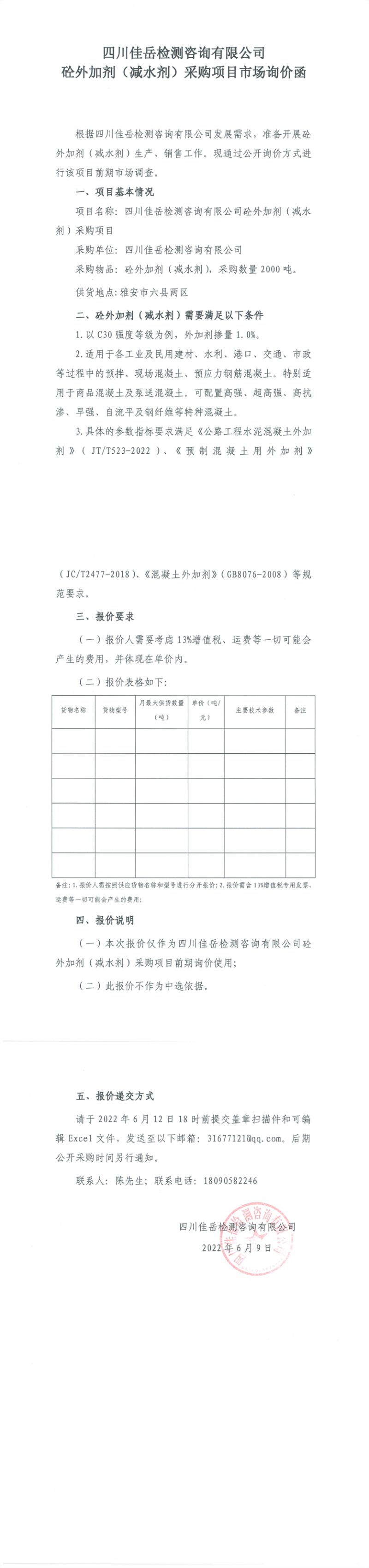 四川佳岳檢測(cè)咨詢有限公司砼外加劑(減水劑)采購項(xiàng)目市場(chǎng)詢價(jià)函