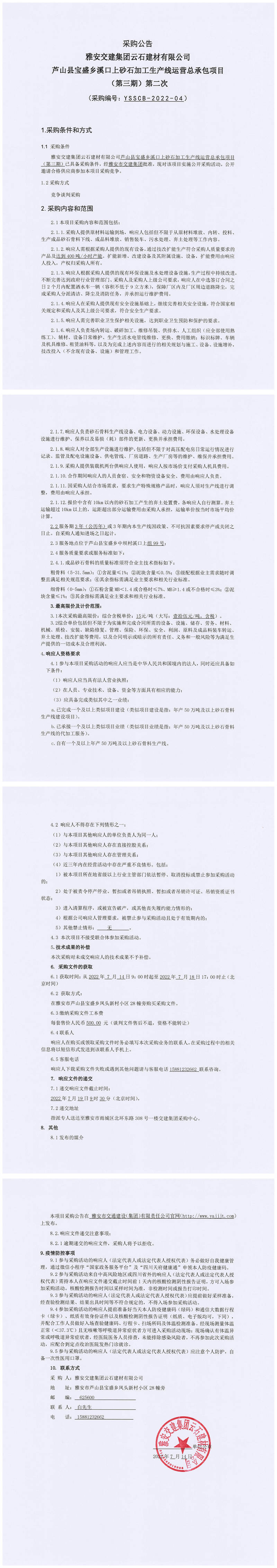 雅安交建集團(tuán)云石建材有限公司蘆山縣寶盛鄉(xiāng)溪口上砂石加工生產(chǎn)線運(yùn)營(yíng)總承包項(xiàng)目(第三期)第二次采購(gòu)公告