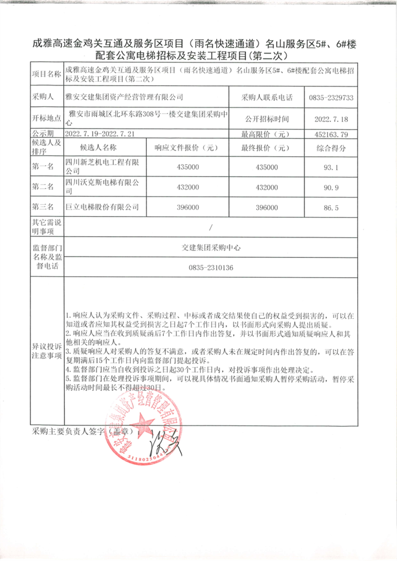 雅安交建集團資產(chǎn)經(jīng)營管理有限公司成雅高速金雞關(guān)互通及服務(wù)區(qū)項目(雨名快速通道)名山服務(wù)區(qū)5#、6#樓配套公寓電梯招標及安裝工程項目招標公告(第二次)結(jié)果公示