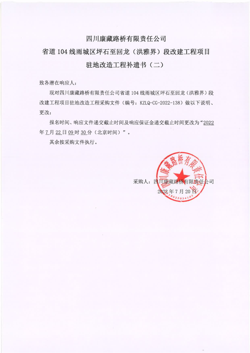 四川康藏路橋有限責(zé)任公司省道104線雨城區(qū)坪石至回龍(洪雅界)段改建工程項(xiàng)目駐地改造工程補(bǔ)遺書(shū)(二)