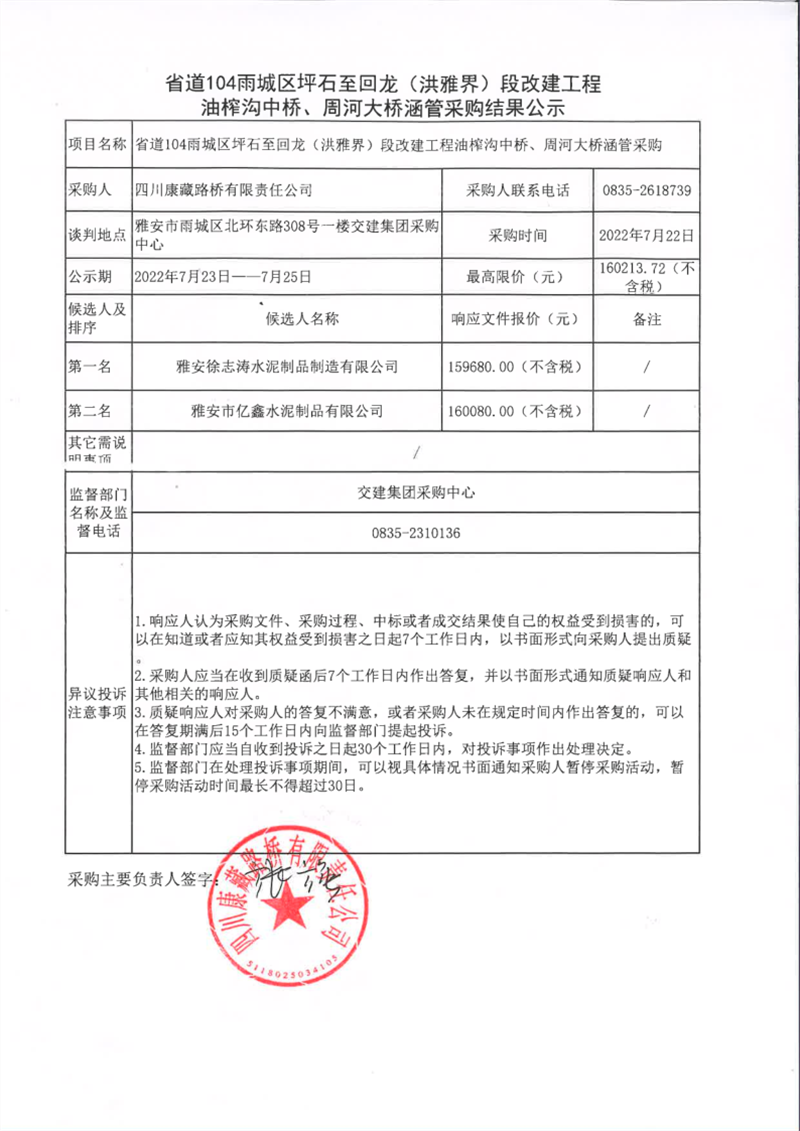 四川康藏路橋有限責(zé)任公司省道104雨城區(qū)坪石至回龍(洪雅界)段改建工程油榨溝中橋、周河大橋涵管采購結(jié)果公示