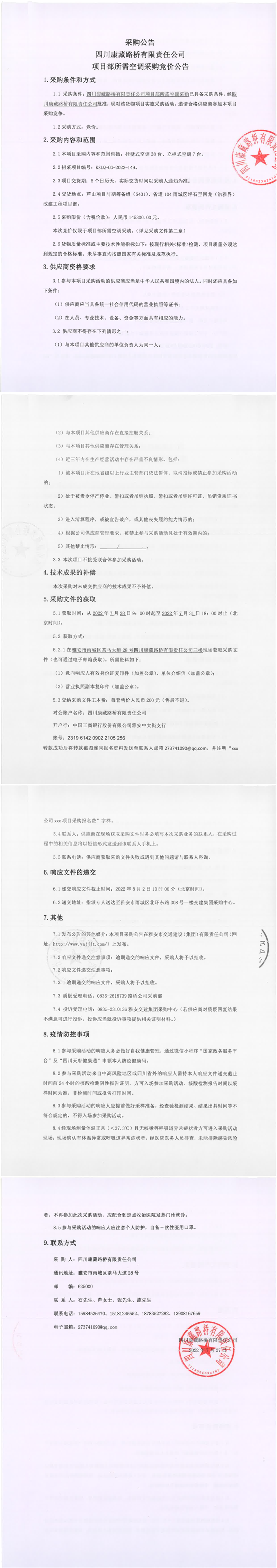 四川康藏路橋有限責任公司項目部所需空調(diào)采購競價公告