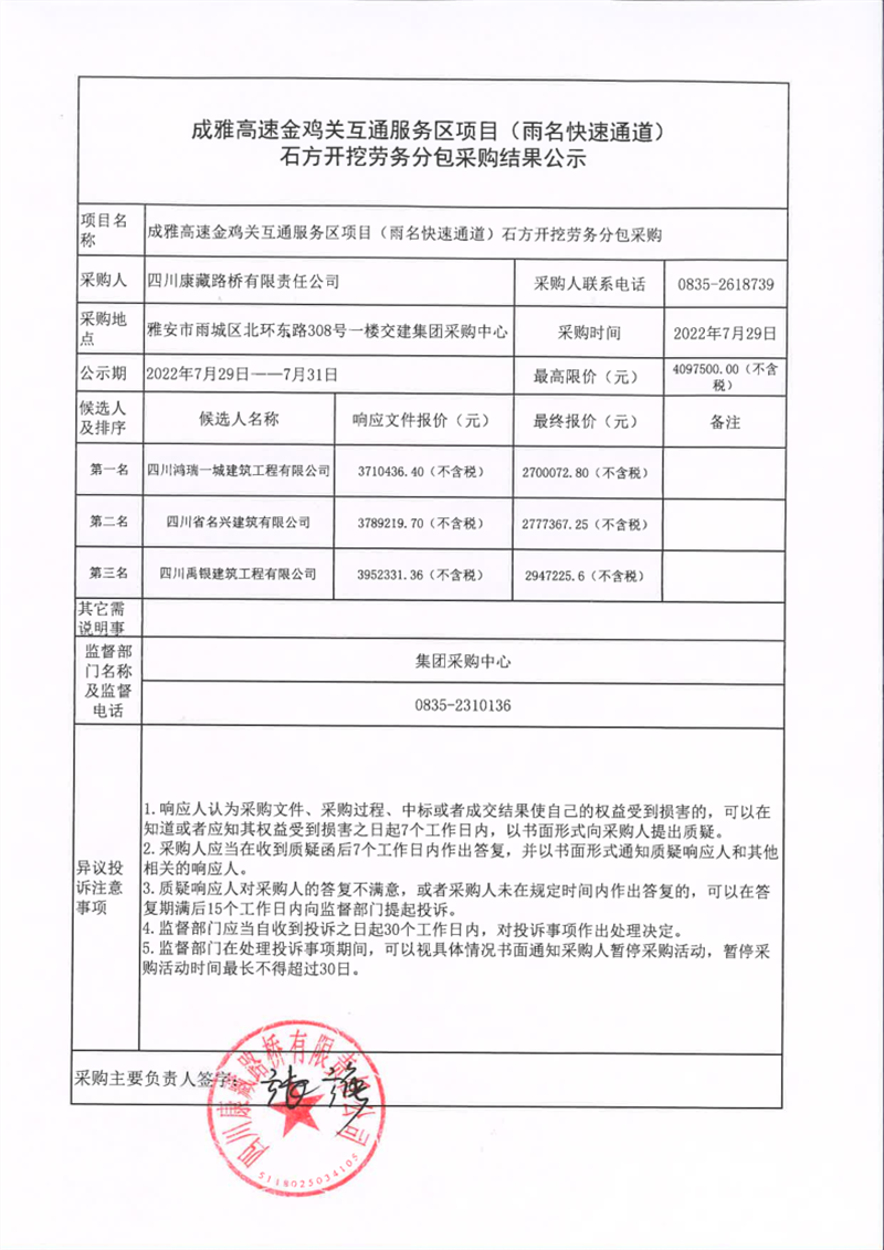四川康藏路橋有限責(zé)任公司成雅高速金雞關(guān)互通服務(wù)區(qū)項(xiàng)目(雨名快速通道)石方開(kāi)挖勞務(wù)分包采購(gòu)結(jié)果公示