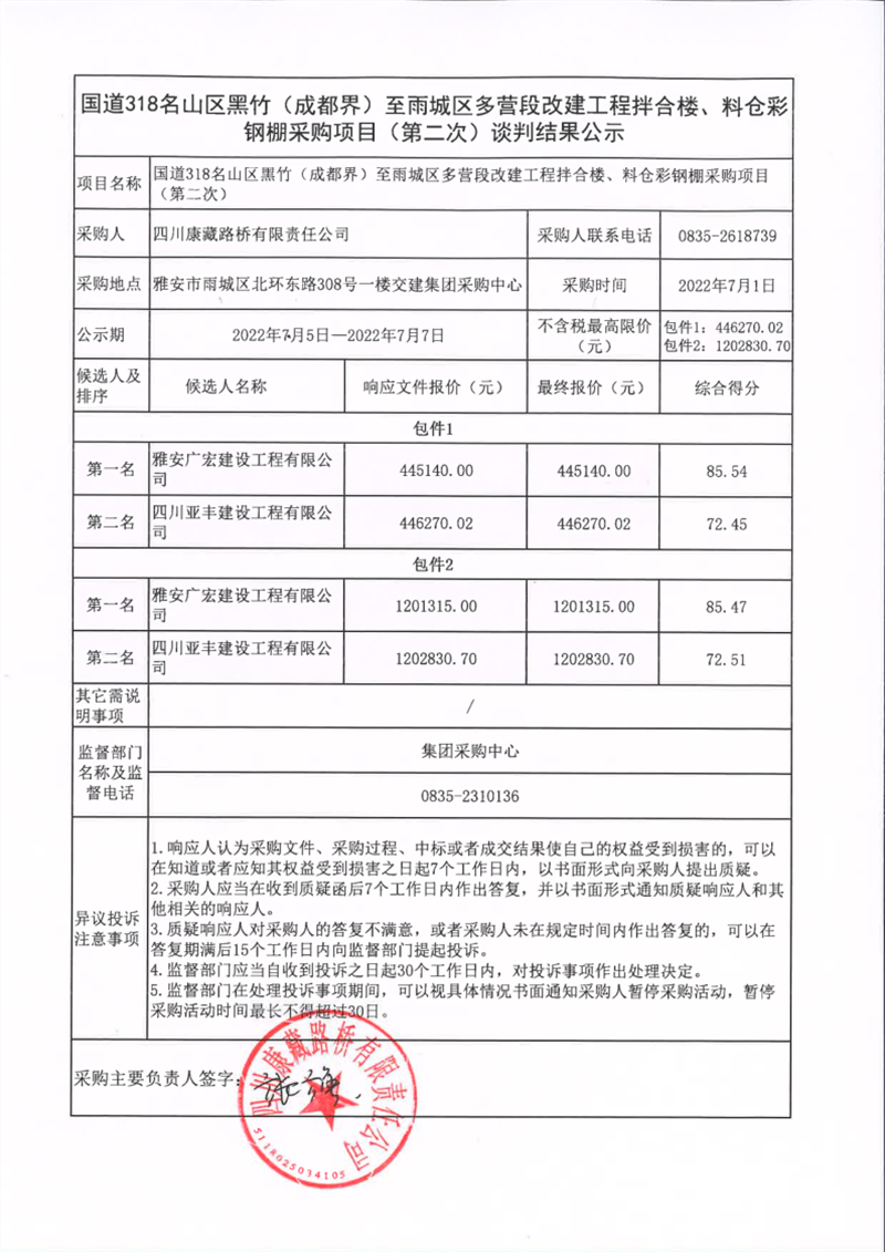 四川康藏路橋有限責(zé)任公司國(guó)道318名山區(qū)黑竹(成都界)至雨城區(qū)多營(yíng)段改建工程拌合樓、料倉彩鋼棚采購項(xiàng)目(第二次)談判結(jié)果公示