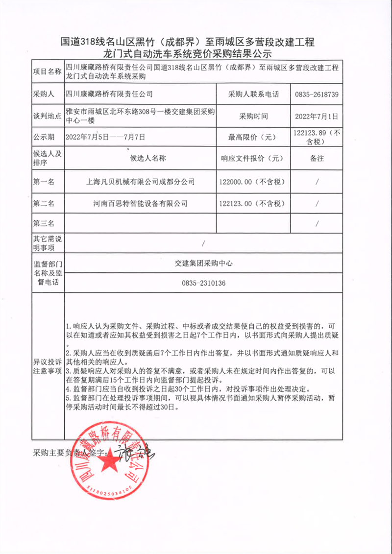 四川康藏路橋有限責(zé)任公司國道318名山區(qū)黑竹(成都界)至雨城區(qū)多營段改建工程龍門式自動洗車系統(tǒng)競價采購結(jié)果公示
