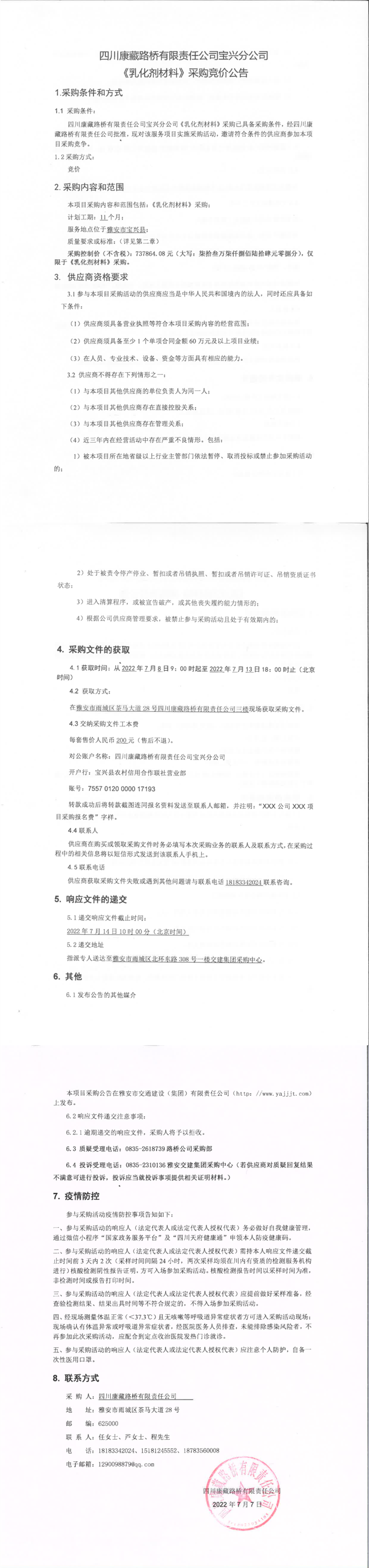 四川康藏路橋有限責(zé)任公司寶興分公司乳化劑材料采購(gòu)競(jìng)價(jià)公告