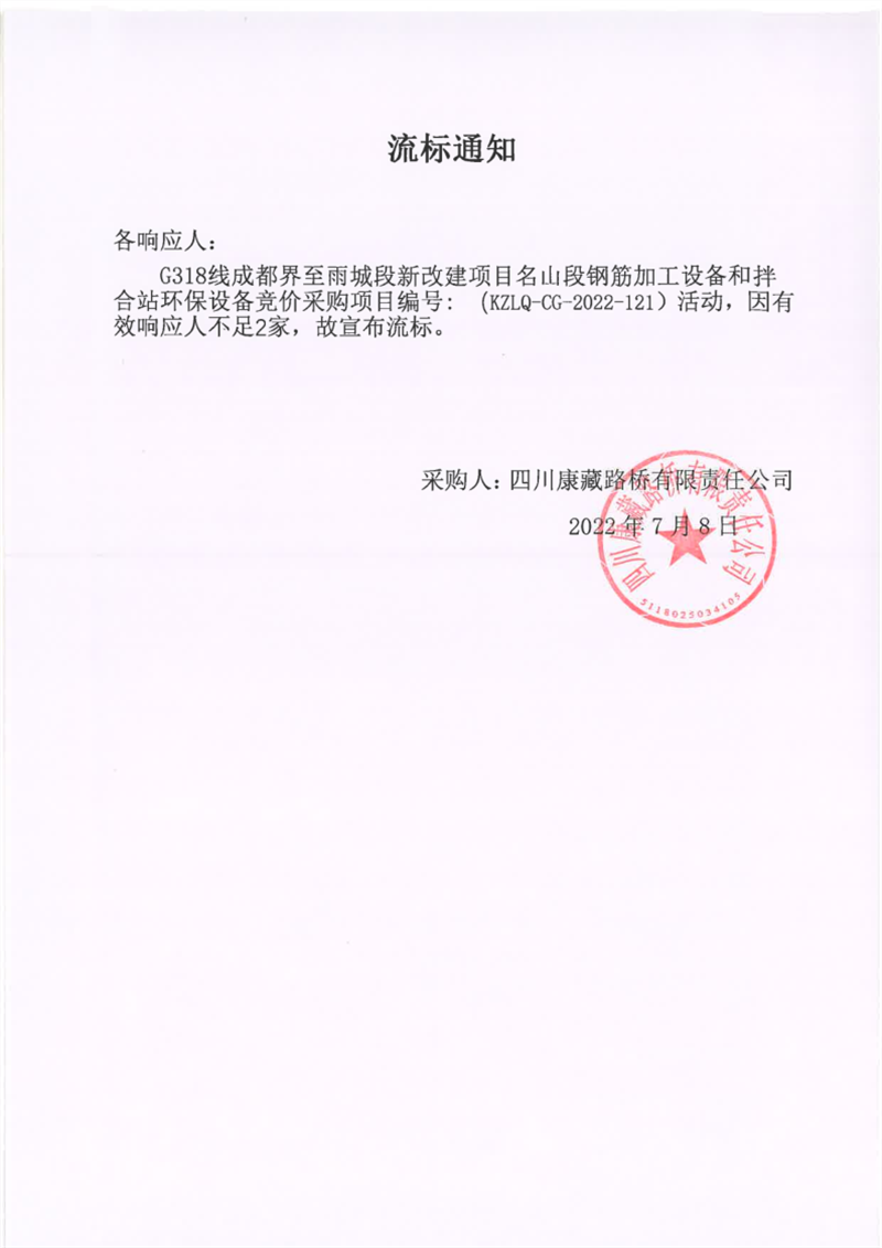 四川康藏路橋有限責任公司G318線成都界至雨城段新改建項目名山段鋼筋加工設備和拌合站環(huán)保設備競價采購項目流標通知