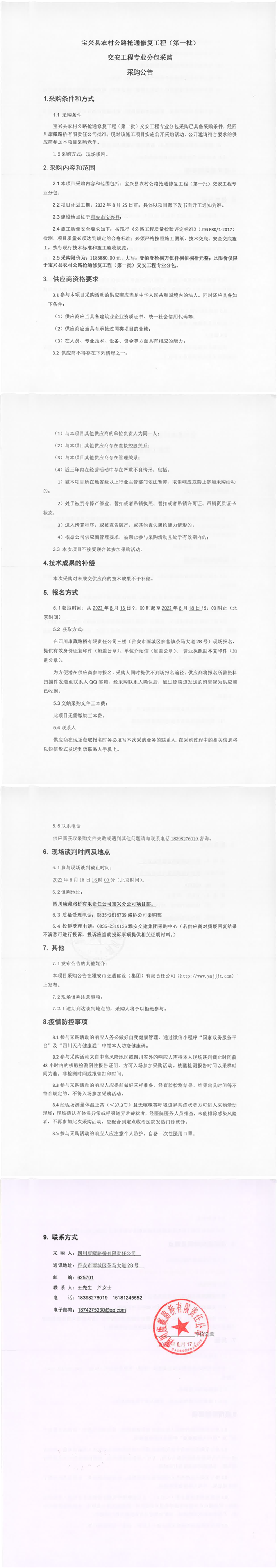 四川康藏路橋有限責(zé)任公司寶興縣農(nóng)村公路搶通修復(fù)工程(第一批)交安工程專業(yè)分包采購(gòu)采購(gòu)公告