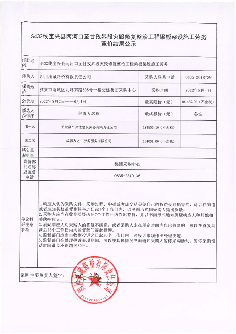 四川康藏路橋有限責(zé)任公司S432線寶興縣兩河口至甘孜界段災(zāi)毀修復(fù)整治工程梁板架設(shè)施工勞務(wù)競(jìng)價(jià)結(jié)果公示