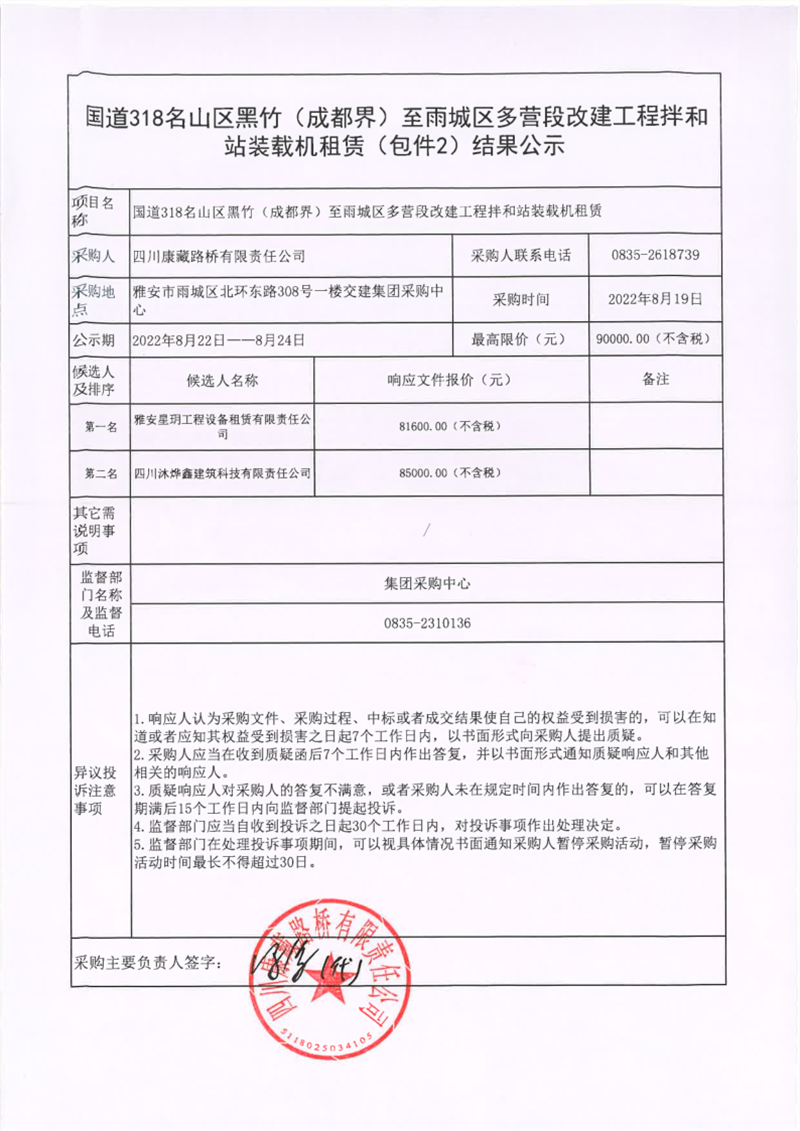 四川康藏路橋有限責任公司國道318名山區(qū)黑竹(成都界)至雨城區(qū)多營段改建工程拌和站裝載機租賃(包件2)結果公示