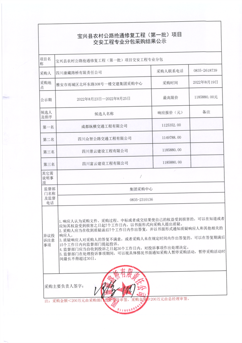 四川康藏路橋有限責(zé)任公司寶興縣農(nóng)村公路搶通修復(fù)工程(第一批)交安工程專業(yè)分包采購(gòu)結(jié)果公示