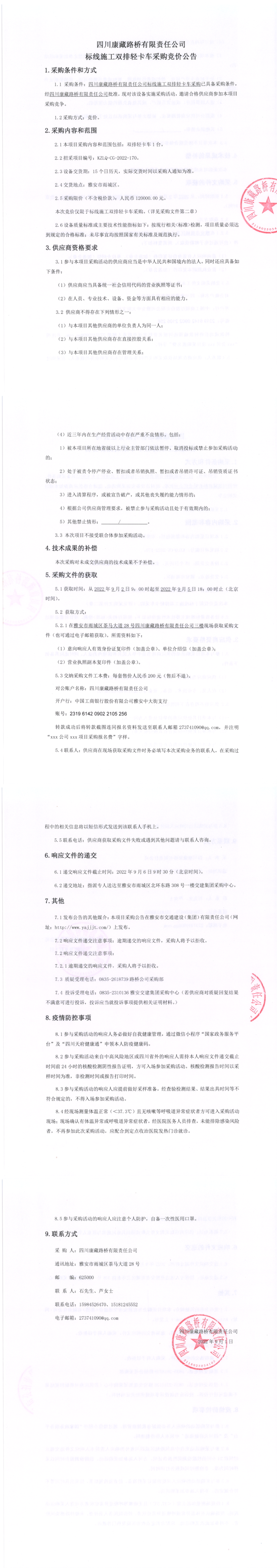 四川康藏路橋有限責(zé)任公司標(biāo)線施工雙排輕卡車采購競價公告