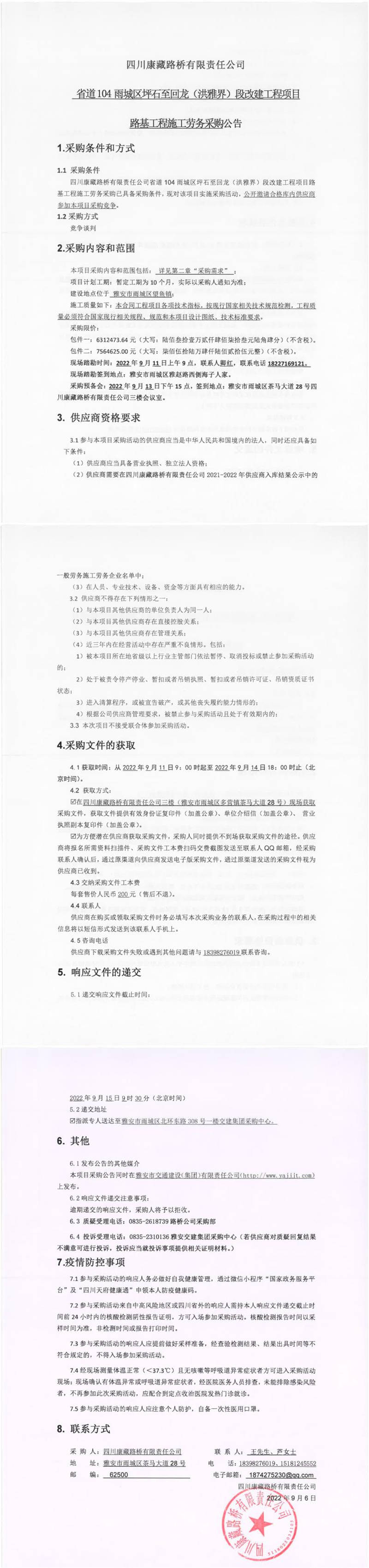 四川康藏路橋有限責任公司省道104雨城區(qū)坪石至回龍(洪雅界)段改建工程項目路基工程施工勞務(wù)采購公告
