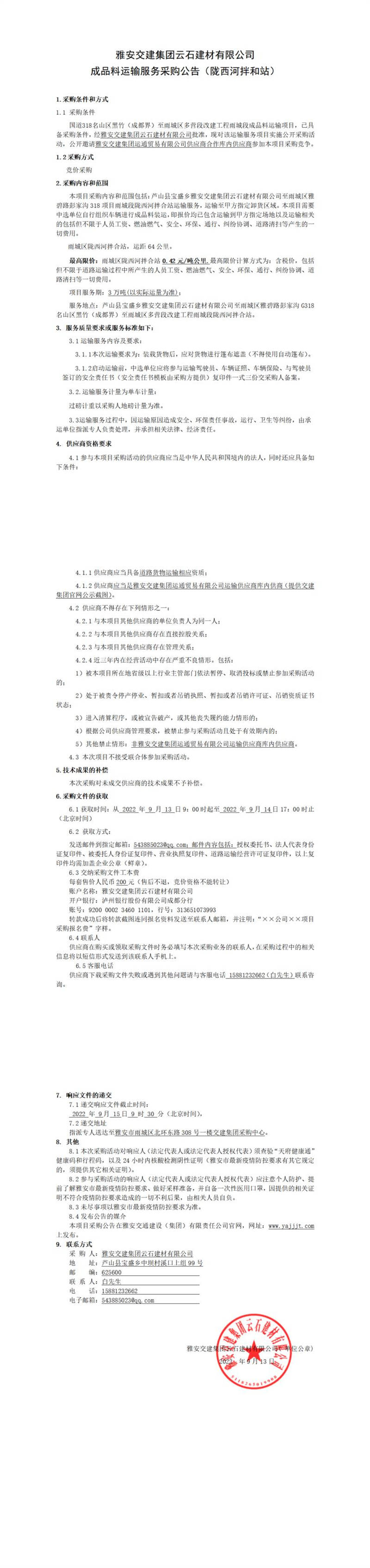雅安交建集團云石建材有限公司成品料運輸服務采購公告(隴西河拌和站)