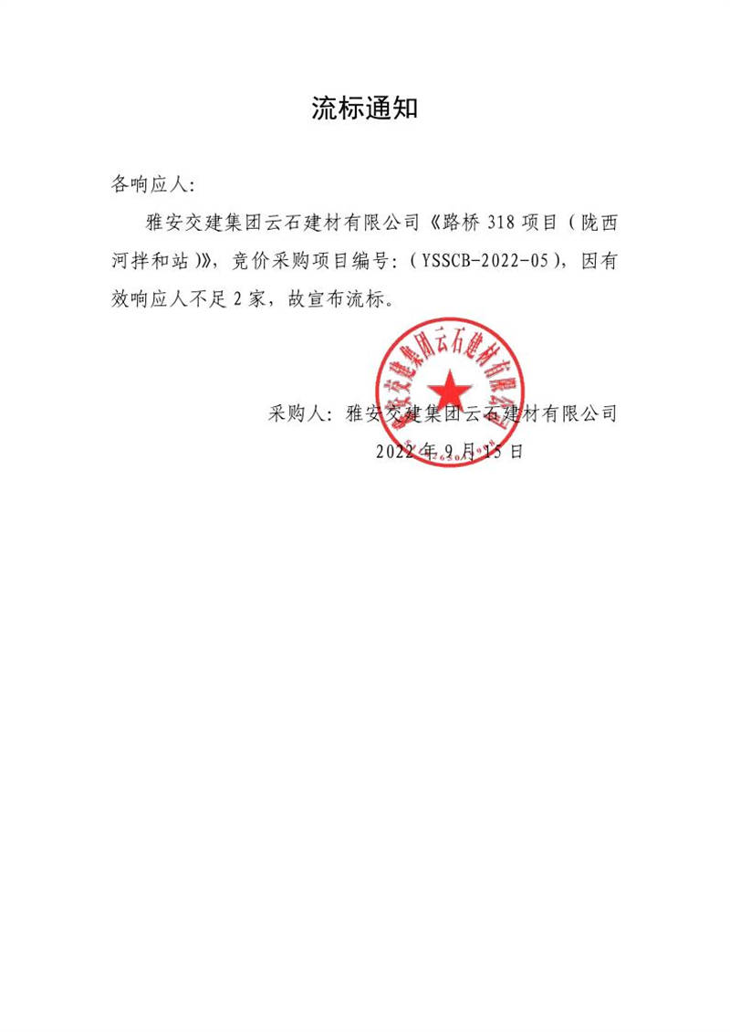雅安交建集團云石建材有限公司成品料運輸服務采購(皇茶大道拌和站)流標通知