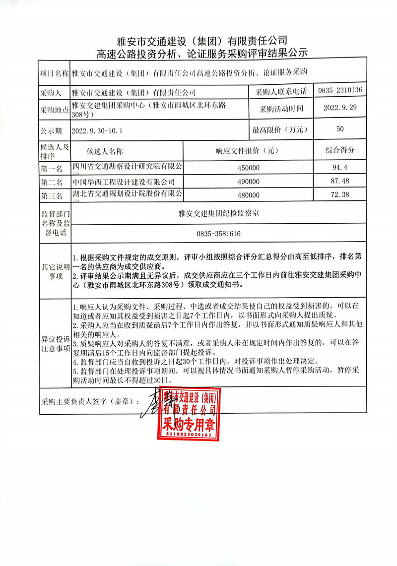 雅安市交通建設(shè)(集團)有限責任公司高速公路投資分析、論證服務(wù)采購評審結(jié)果公示