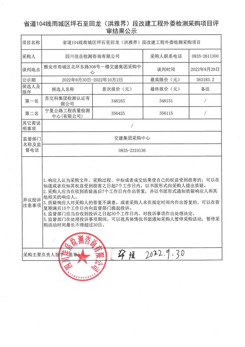 四川佳岳檢測(cè)咨詢有限公司省道104線雨城區(qū)坪石至回龍(洪雅界)段改建工程外委檢測(cè)采購項(xiàng)目評(píng)審結(jié)果公示
