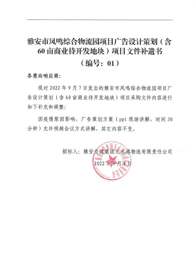 雅安交建集團(tuán)無水港物流有限責(zé)任公司雅安市鳳鳴綜合物流園項目廣告設(shè)計策劃(含60畝商業(yè)待開發(fā)地塊)項目文件補(bǔ)遺書(編號:01)