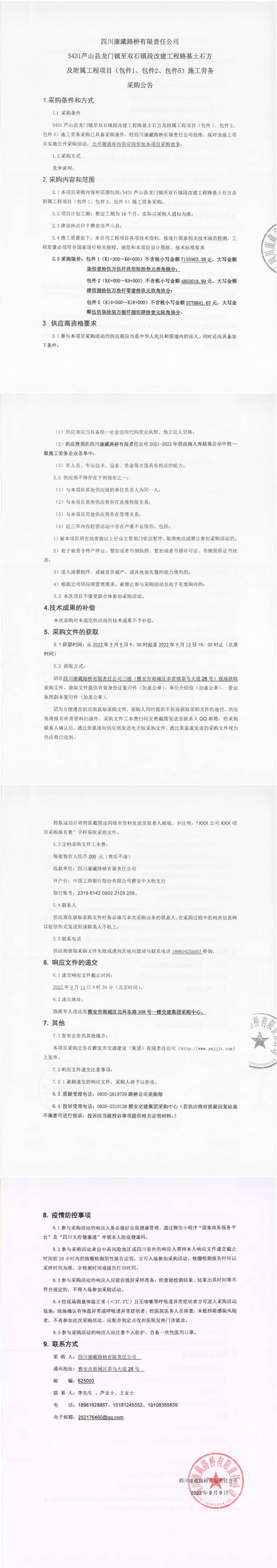 四川康藏路橋有限責(zé)任公司S431蘆山縣龍門(mén)鎮(zhèn)至雙石段改建工程路基土石方及附屬工程項(xiàng)目(包件1、包件2、包件5)施工勞務(wù)采購(gòu)公告