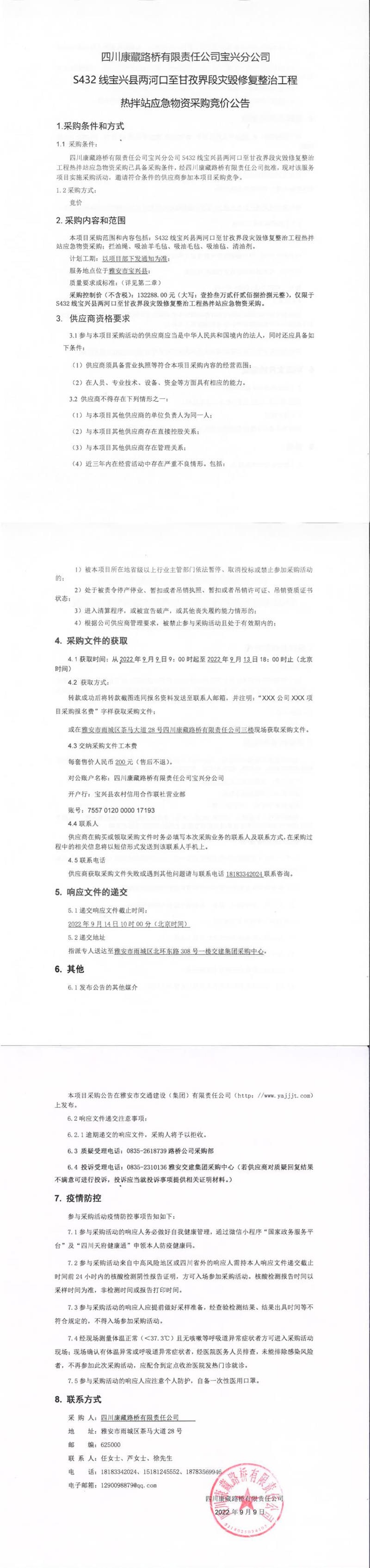四川康藏路橋有限責任公司S432線寶興縣兩河口至甘孜界段災毀修復整治工程熱拌站應急物資采購競價公告